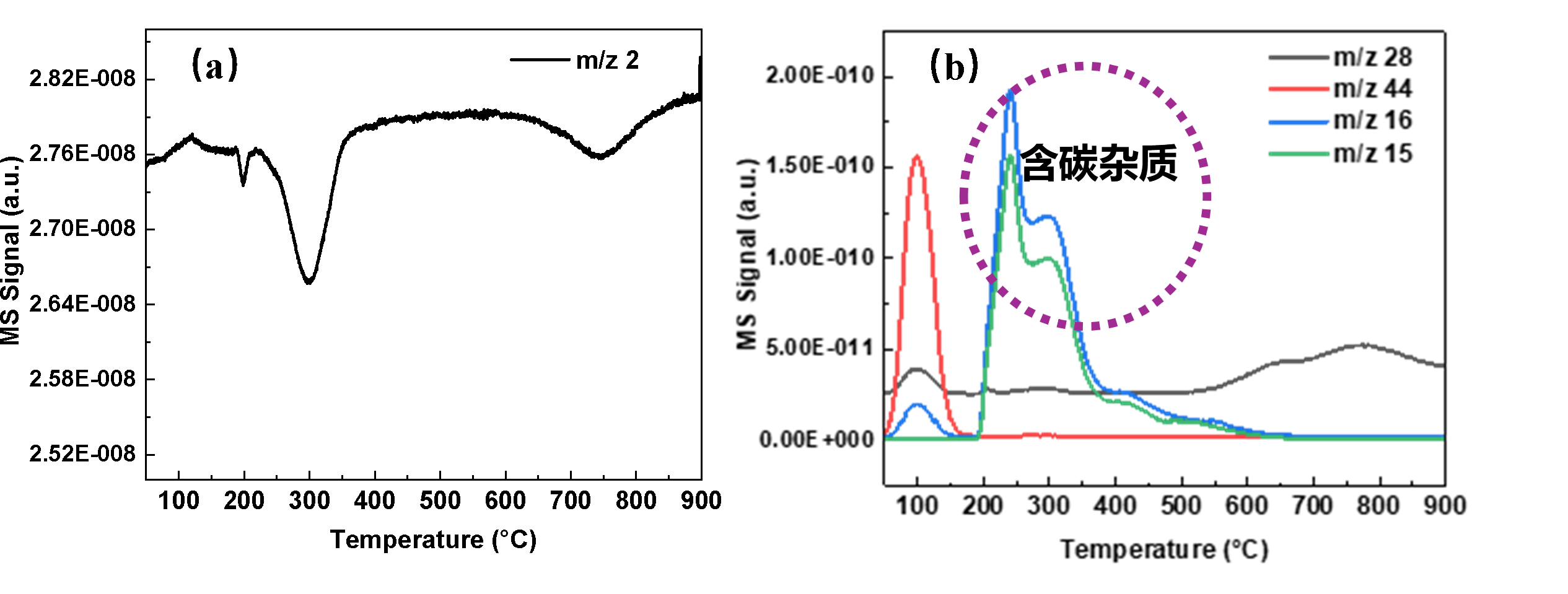质谱才是“全能选手”!以镍基催化剂H₂-TPR为例(图3、4),TCD信号看着正常,但质谱不仅验证了氢气消耗(m/z=2),还检测到CO₂、CH₄(m/z=44、16、15等)生成,证实样品含碳杂质——这是TCD完全做不到的。