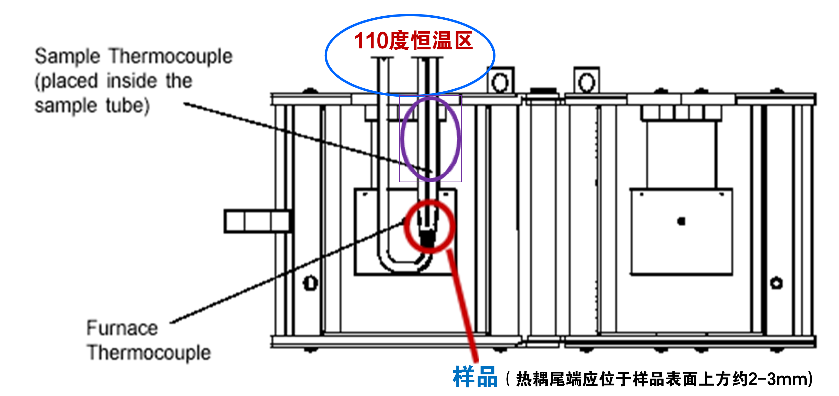 为什么?看加热炉结构图(图2)就懂了:样品管上端处于110℃恒温区,沾在管壁的样品相当于提前被加热,自然出现异常信号。正确操作是让样品只待在红色圈出区域,热偶尾端离样品表面2-3mm才合规。