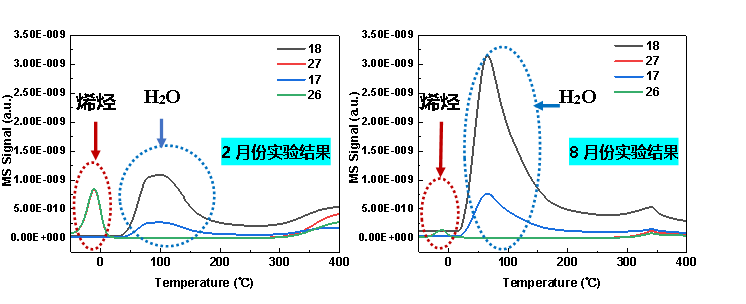 有同学做分子筛烯烃-TPD实验,春天数据规律,夏天却脱附量骤减、峰形异常,差点怀疑人生。对比数据发现,夏天样品水的脱附量是春天的3倍(图6)——原来样品放久吸水,影响了烯烃吸附!重新制备新鲜样品,结果立马恢复正常。