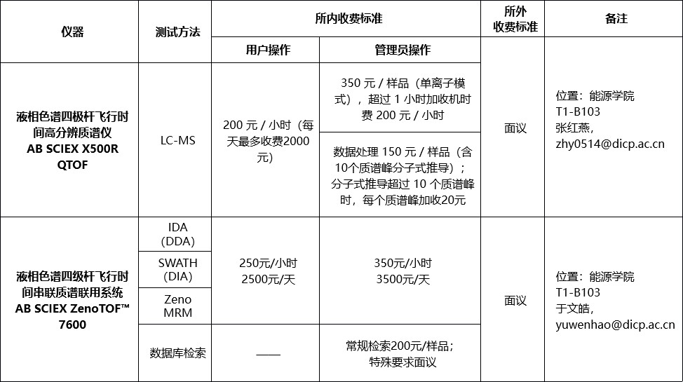 能源研究技术平台新购置的液相色谱四极杆飞行时间质谱仪X500R和ZenoTOF 7600已经完成安装调试工作,将于近期对外开放预约测试。现将收费标准公示如下: