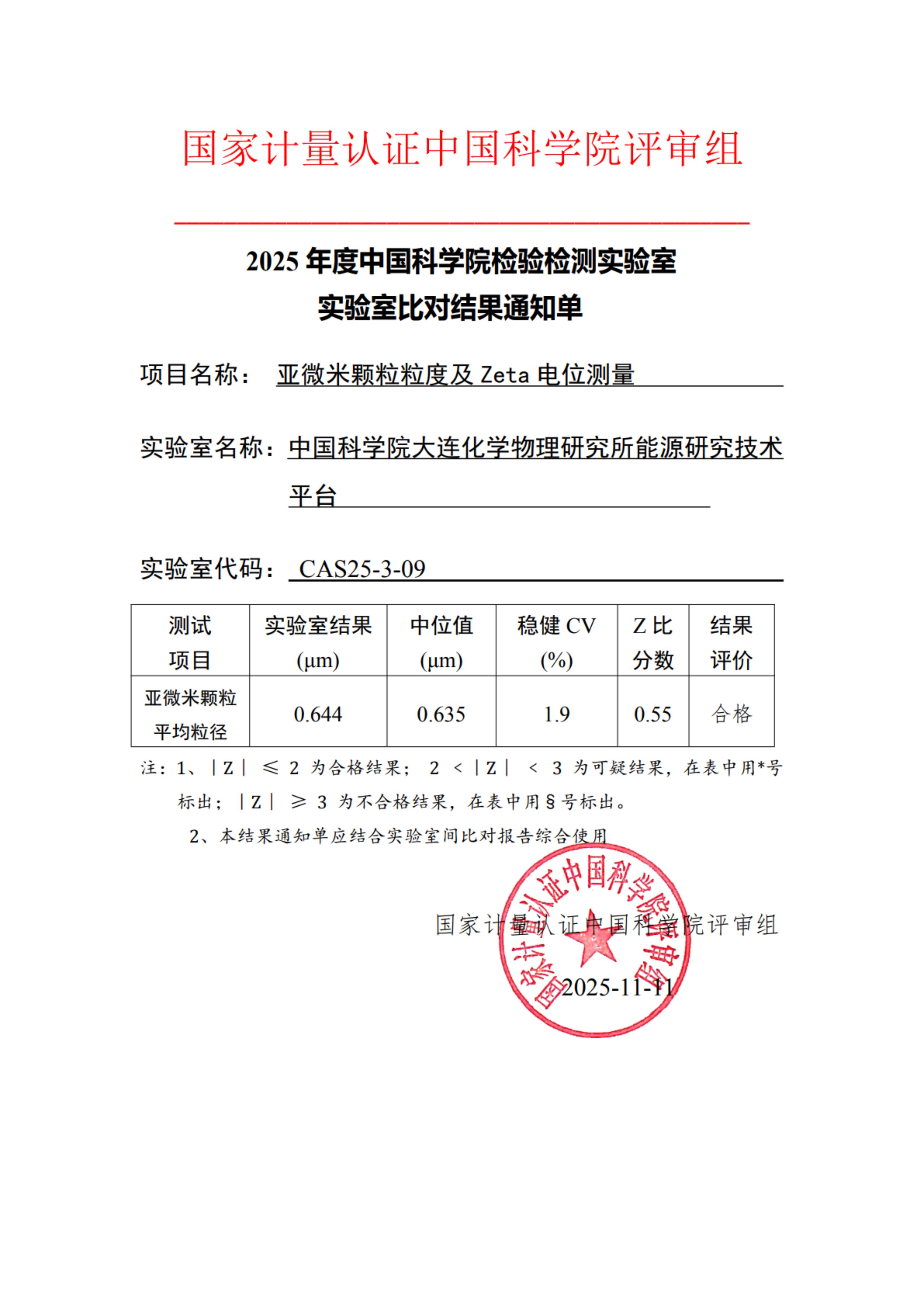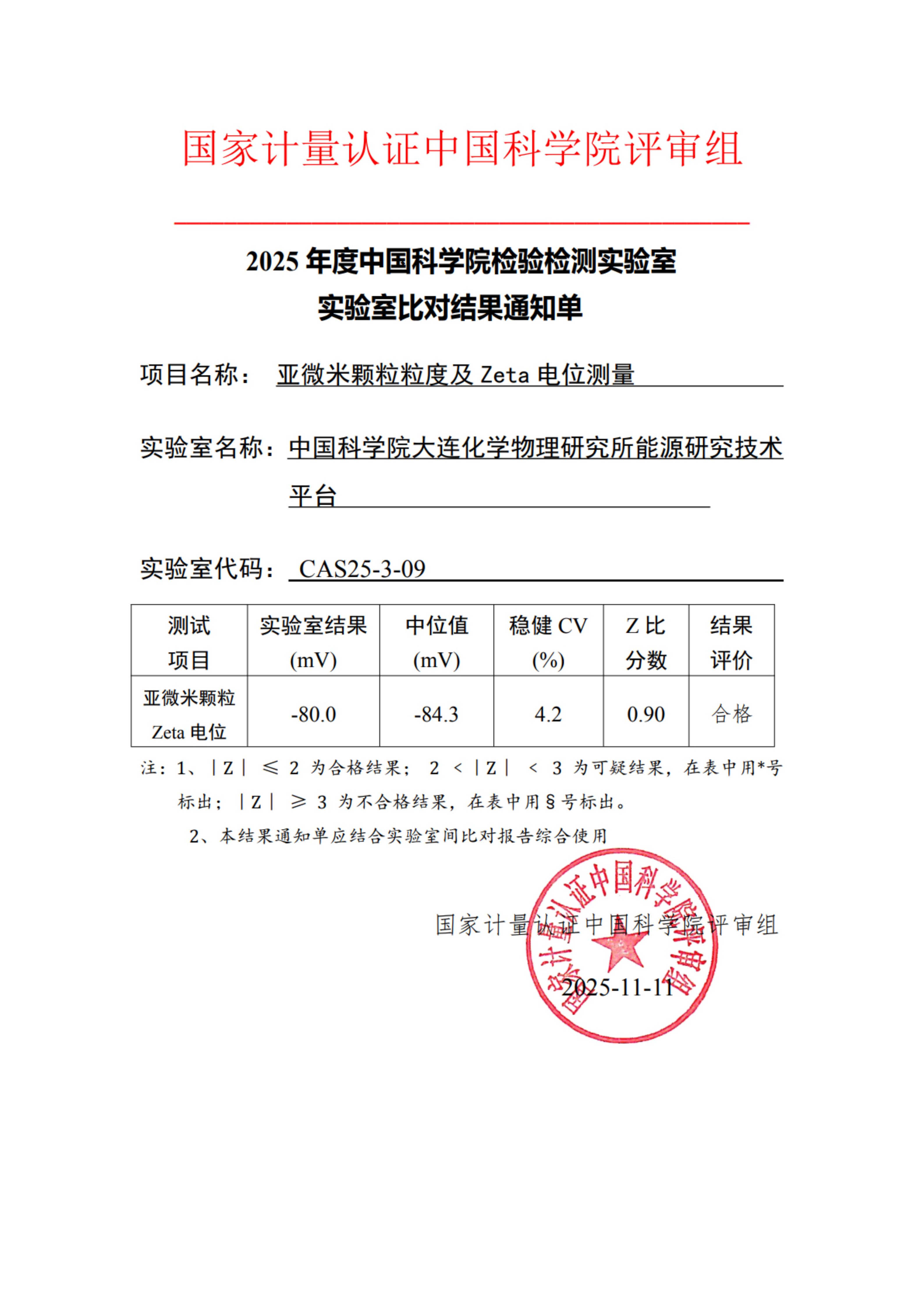 近日,在由国家计量认证中国科学院评审组组织的“2025年度中国科学院检验检测实验室能力验证/实验室间比对活动”中,平台杨婷采用纳米激光粒度仪(Malvern Zetasizer NanoZS90,2010)完成了“亚微米颗粒粒度及Zeta电位测量”项目,所有比对结果均为合格,表现优异,取得良好成绩。实验室能力验证/实验室间比对是国际通行的评价方式,能够客观反映参评实验室在特定检测项目上的技术水平,结果分为“合格”与“不合格”两类。